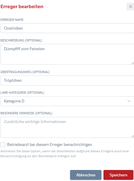 Bei der Anlage eines neuen Erregers können der Name, ggf. eine Beschreibung, ggf. Übertragungsweg, ggf. die LARE Kategorie, ggf. besondere Hinweise eingetragen werden und zusätzlich ausgewählt werden, ob der Betriebsarzt benachrichtigt werden soll.