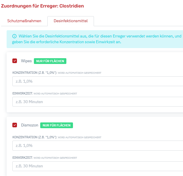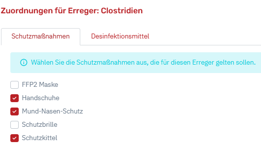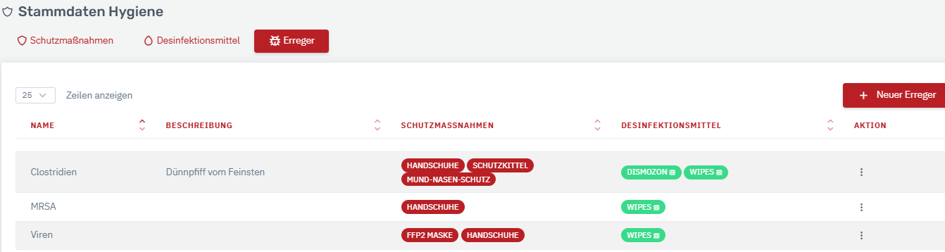 Wenn man einen Erreger angelegt hat, können über das Bearbeitungssymbol (die "drei Punkte" hinter dem Erreger in der Spalte "Aktionen") Zuordnungen getroffen werden. Es können zu jedem Erreger die benötigten Desinfektionsmittel und die entsprechenden Schutzmaßnahmen hinterlegt werden (diese müssen davor in den Stammdaten angelegt worden sein). Diese Punkte sind im Desinfektionsformular für die Mitarbeiter (in der Wachansicht) vorausgefüllt dann.