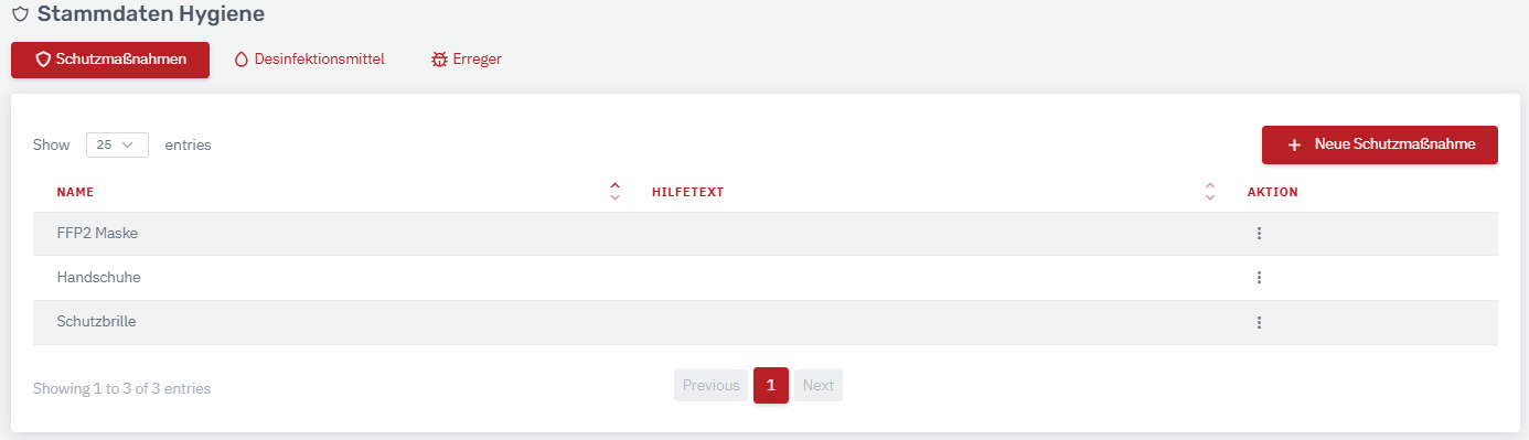 Über die Stammdaten können verschiedenen Schutzmaßnahmen, Desinfektionsmittel und Erreger hinterlegt werden, aus welchen durch die Mitarbeiter in der Wachansicht (Menüpunkt "Desinfektion") ein Desinfektionsprotokoll erstellt werden kann.